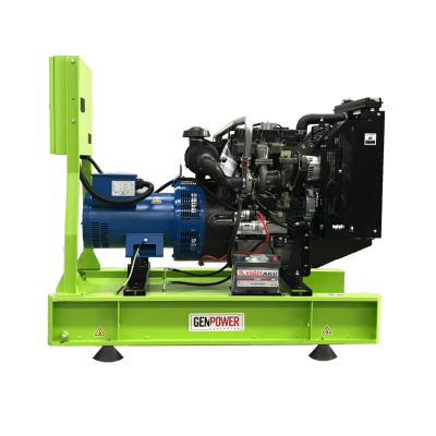 The GPR 17 generator operates at 1500 RPM and a frequency of 50 Hz, featuring a PERKINS 403A-15G2 engine and running on diesel fuel. It provides a voltage output of 231/400 V and has a fuel consumption rate of 3.10 liters per hour at 75% load. The fuel tank capacity is 58 liters for the open type and 40 liters for the cab version. The generator’s dimensions are 500 mm in width, 1400 mm in length, and 1330 mm in height for the open type, while the cab version measures 942 mm in width, 1916 mm in length, and 1444 mm in height. The weight is 485 kg for the open type and 596 kg for the cab version.