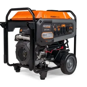 Generac.GP6500 portable generator offers PowerRush.Advanced Technology, which delivers more than a 40% increased starting capacity.allowing you to do more with less. Generac’s OHV.engine and large.capacity steel fuel tank ensures extended engine life and run times, while the steel tube cradle provides added strength.The low-oil feature protects the generator from damage.The GP6500 can be easily transported across rough or difficult terrain with the heavy-duty wheels and easy fold-down handle. Even maintenance is a breeze, with the hour meter keeping track of necessary upkeep at regular intervals.